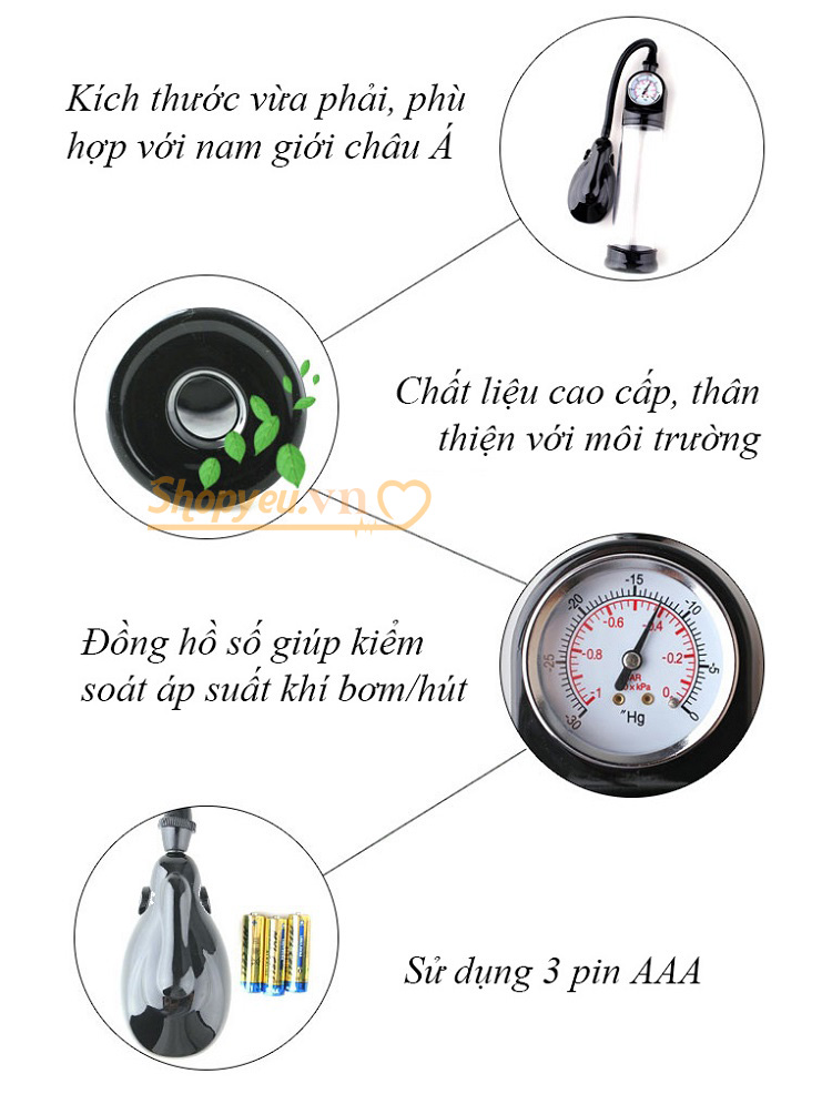 Chức năng: máy tự động bơm/hút và có đồng hồ đo áp suất khí tác động lên dương vật.