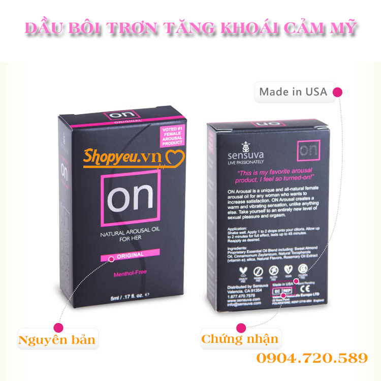 Dầu bôi trơn tăng khoái cảm cao cấp Sensuva ON là sản phẩm nhập khẩu từ Mỹ với công thức thực vật mạnh mẽ gây sốc này tạo ra một cảm giác râm ran ấm áp và vô cùng độc đáo, đánh thức các đầu dây thần kinh nhạy cảm, làm tăng lưu lượng máu tại âm đạo và âm vật khiến phụ nữ cảm thấy ham muốn, nhạy cảm hơn bao giờ hết!