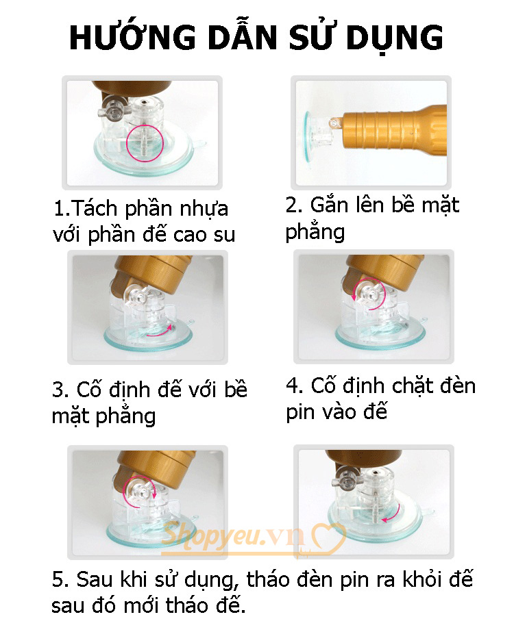 Sản phẩm hoàn toàn không thấm nước bạn có thể tháo dời từng bộ phận vệ sinh bằng nước ấm hoặc cồng, để khô tự nhiên hoăc lau khô trước khi sử dụng. Bạn bôi 1 chút gel bôi trơn lên đầu miêng của âm đạo "chỗ đầu đèn pin" bạn có thể sử dụng tay cầm đèn pin để sử dụng hoặc bạn gắn lên bất kỳ bề mặt nhắn nào để sử dụng như: mặt bàn, thành dường, nhà tắm.......