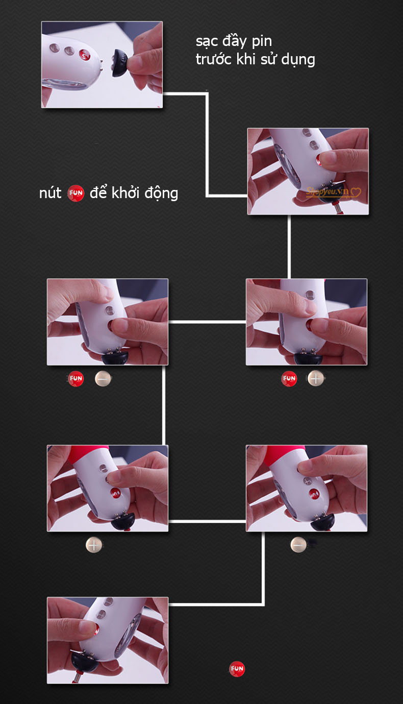 - Bạn bật nguồn và điều chỉnh các chế độ rung, theo ý thích và máy massage đến các điểm nhạy cảm trên cơ thể và âm đạo để tạo sự kích thích hưng phấn, khoái cảm cho mình khi tự sướng hay cho bạn tình trước khi đưa dương vật vào.