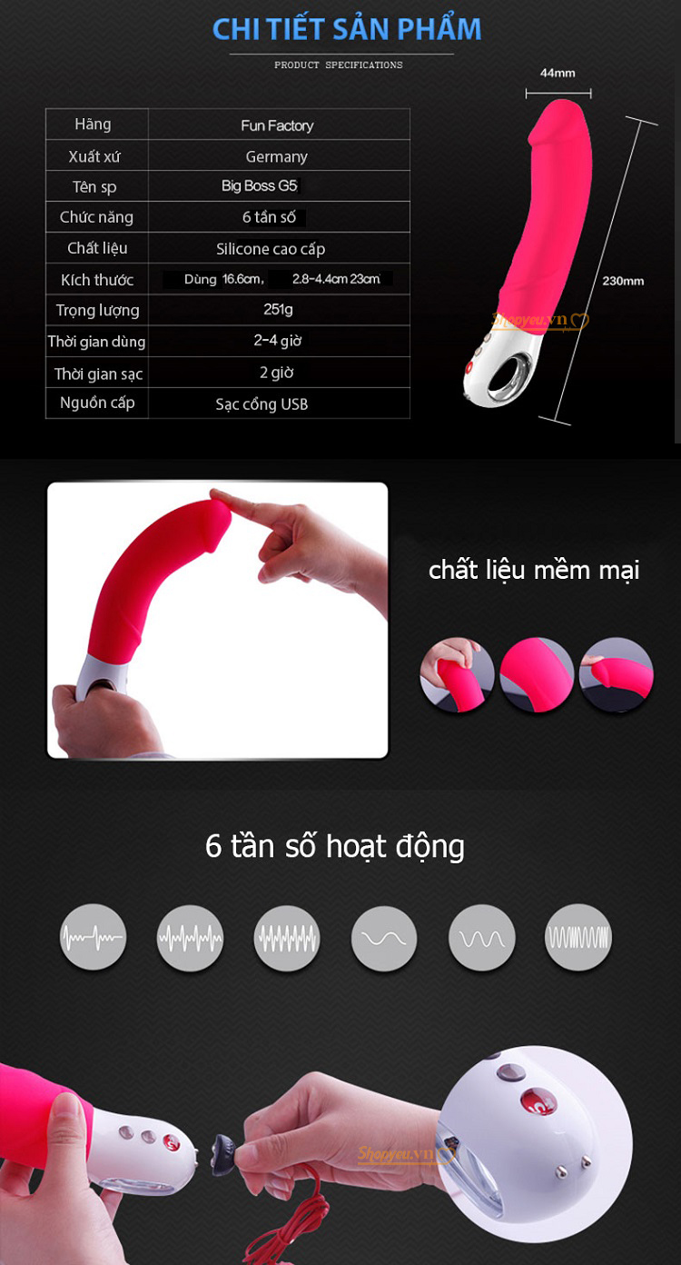 Được làm bằng chất liệu silicone đạt tiêu chuẩn quốc tế, tuyệt đối an toàn cho người sử dụng. BIG BOSS G5 có tới 12 chương trình rung khác nhau mang đến sự khoái cảm từ nhẹ cho đến mạnh. Dù là khi bạn sử dụng để tự sướng hay sử dụng để dạo đầu trước khi quan hệ khi chơi cùng bạn tình của mình, thì chăc chắn Big Boss G5 sẽ mang lại cho bạn nhiều kỷ niệm khó phai.