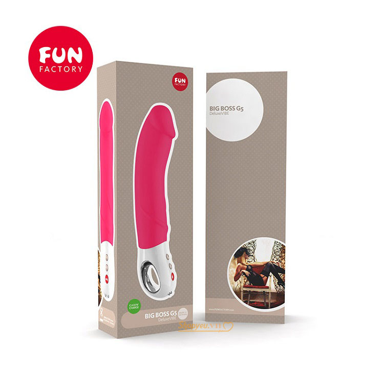 Dương vật giả rung Fun Factory Big boss G5 có thiết kế hinh dáng như dương vật người đàn ông lực lưỡng, khoe mạnh và rắn chắc. Fun Factory Big boss G5 có trục silicone cong nhẹ nhàng xoay quanh viền vùng kín của người dùng với kích thích tới 4 cm. Dương vật giả rung BIG BOSS Ấn tượng vì nó, nhờ vào công nghệ Flexi FUN cùng với động cơ mạnh phân bố đồng đều các rung động trong toàn bộ từ thân cho đến đầu sản phẩm giúp nó tiếp cận mạnh mẽ ngay cả những điểm đam mê tiềm ẩn sâu nhất vùng kín người sử dụng.