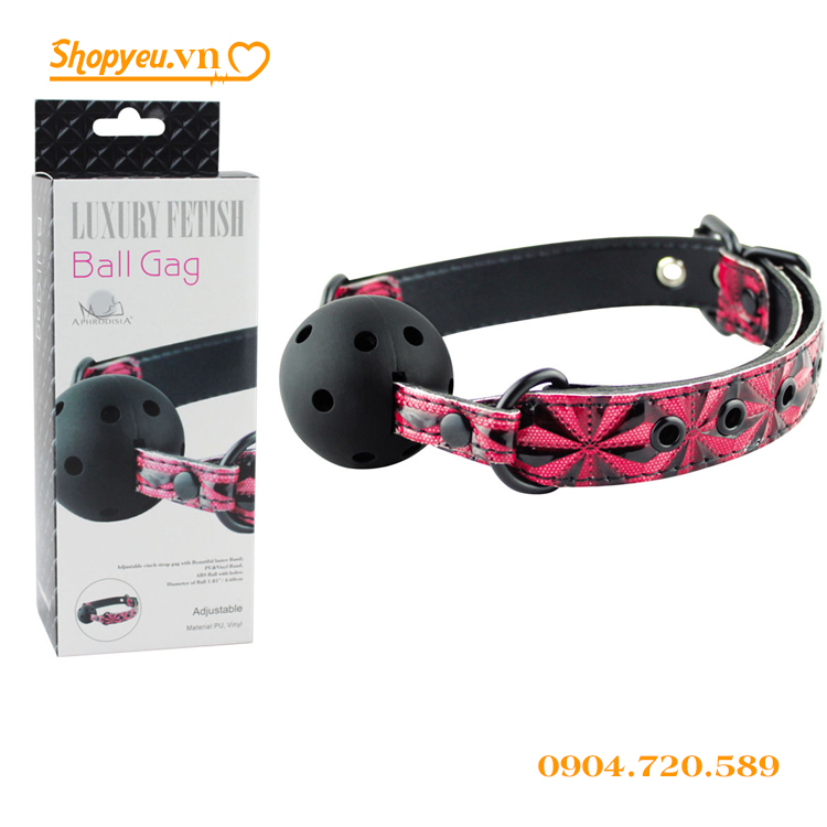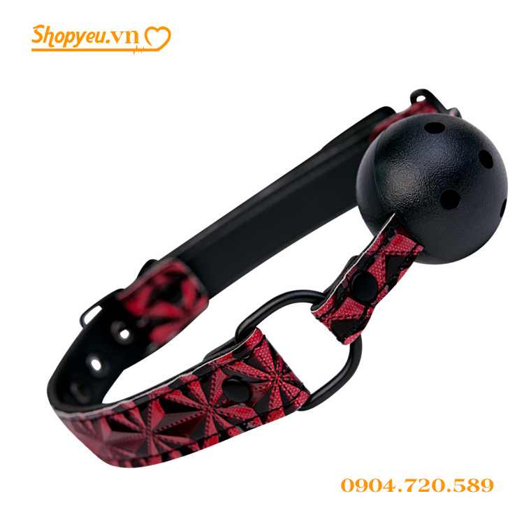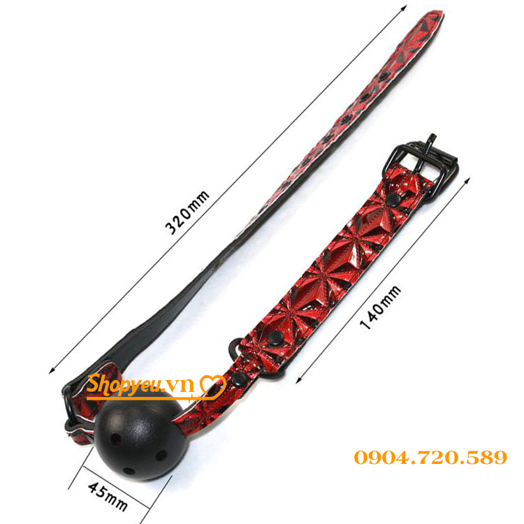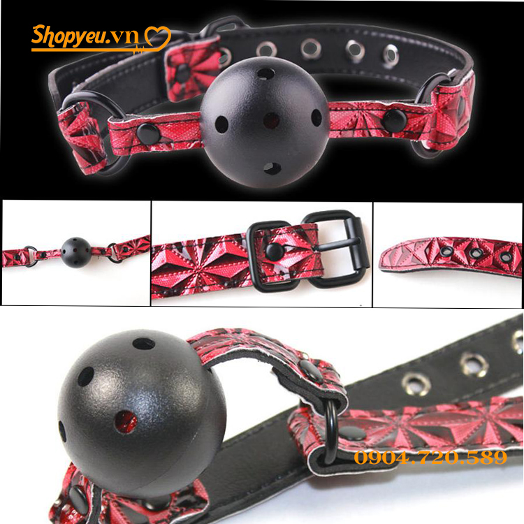 Khóa miệng bạn tình có bóng tròn mầu đen với đường kính bóng 4,6 cm, cùng với lỗ thoáng khí giúp bạn dễ dàng thở hơn. Màu dây đeo có màu đỏ, pha đen tạo lên những nét chấm phá cho sản phẩm. Cùng với nhiều nấc giúp người sử dụng dễ dàng chỉnh theo cỡ để đem lại cảm giác thoải mái nhất.