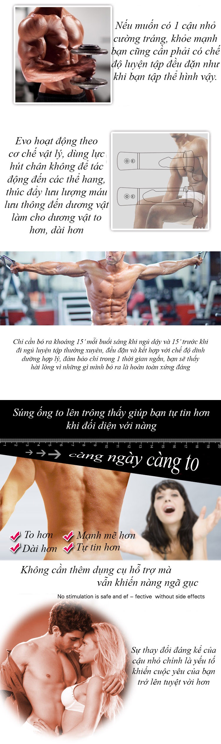 Nếu bạn muốn có 1 dương vật khỏe mạnh, cường tráng thì bạn cũng cần có chế độ tập luyện đều đặn như tập thể hình vậy. Máy tập dương vật to Revo Pennis Pump hoạt động theo cơ chế nguyên tắc của vật lý, sử dụng lực hút chân không để tác động trực tiếp lên dương vật kích thích các thể hang tại đây và thúc đẩy lượng máu lưu thông đên dương vật nhiều hơn. Bởi vậy sẽ kích thích làm cho dươn vật của mình to hơn và dài hơn một cách tự nhiên. Chính vì vậy, khi tập luyện sẽ rất an toàn !