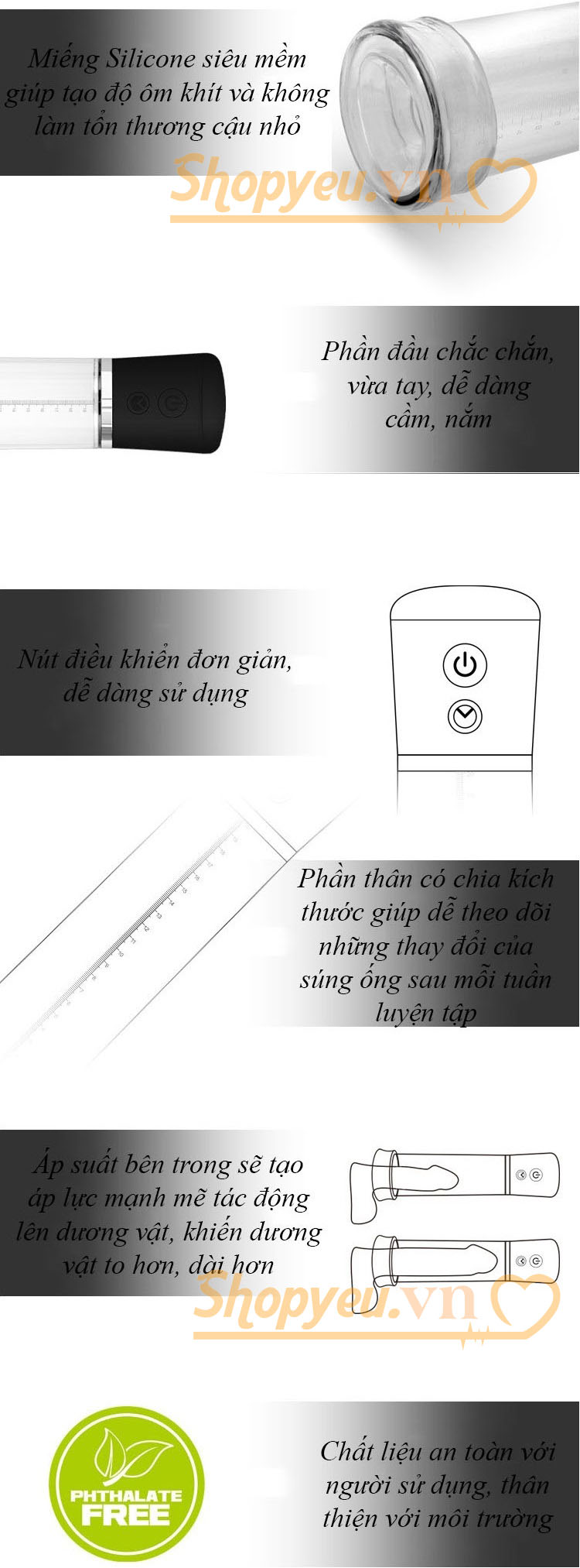 Phần đầu còn lại được lắp bằng miếng silicon cao cấp có độ đàn hồi tốt giúp ôm khít lấy dương vật của người tập. Và phần thân của máy có thước đo dương vật, giúp bạn biết được sự phát triển hay thay đổi của dương vật khi nó to và dài theo từng mốc thời gian mình tập luyện.