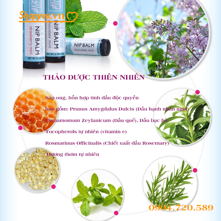 - Thành Phần: Sáp ong, hỗn hợp tinh dầu độc quyền bao gồm: Prunus Amygdalus Dulcis (Dầu hạnh nhân ngọt), Cinnamomum Zeylanicum (Dầu quế), Dầu bạc hà, Tocopherols tự nhiên (vitamin e), Rosmarinus Officinalis (Chiết xuất dầu Rosemary), Hương thơm tự nhiên.