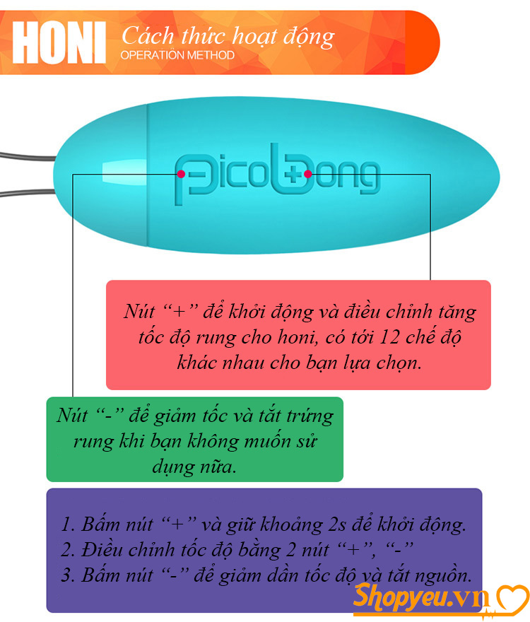 Trứng rung silicon cao cấp PicoBong Honi là một trong những loại đồ chơi tình dục cho nữ được sản xuât bởi hãng PicoBong với kiểu dáng hiện đại nhỏ gọn trang nhã, sản phẩm phù hợp cho mọi đối tượng sử dụng.
