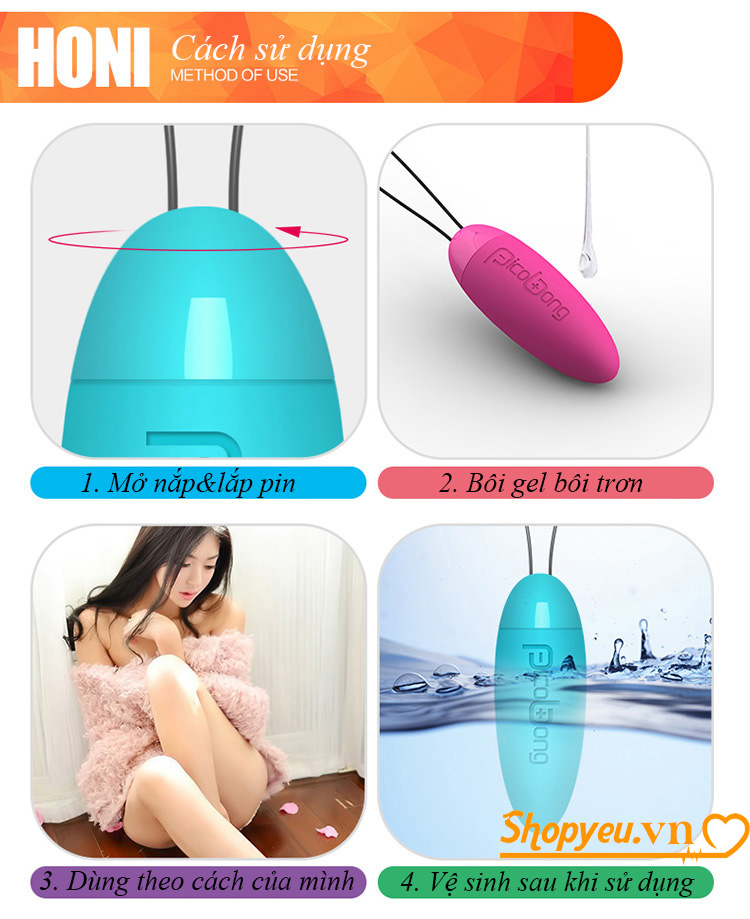 Bạn tháo lắp ở đầu sản phẩm sau đó lắp pin theo đúng chiều quy định rồi đậy lại, bước tiếp bạn điều chỉnh tộc độ rung mà mình muốn rồi đưa trứng đến các điểm nhạy cảm bạn muốn massage tạo cảm giác như đầu vú, hông, eo, mu, hạt le thưởng thức những cảm xúc độc đáo mà sản phẩm đem lại cho bạn. Cuối cùng bạn đưa trứng xâu trong âm đạo để massage đến điểm G mang lại những cảm gics bạn chưa từng được trải qua.