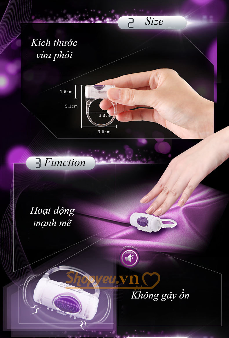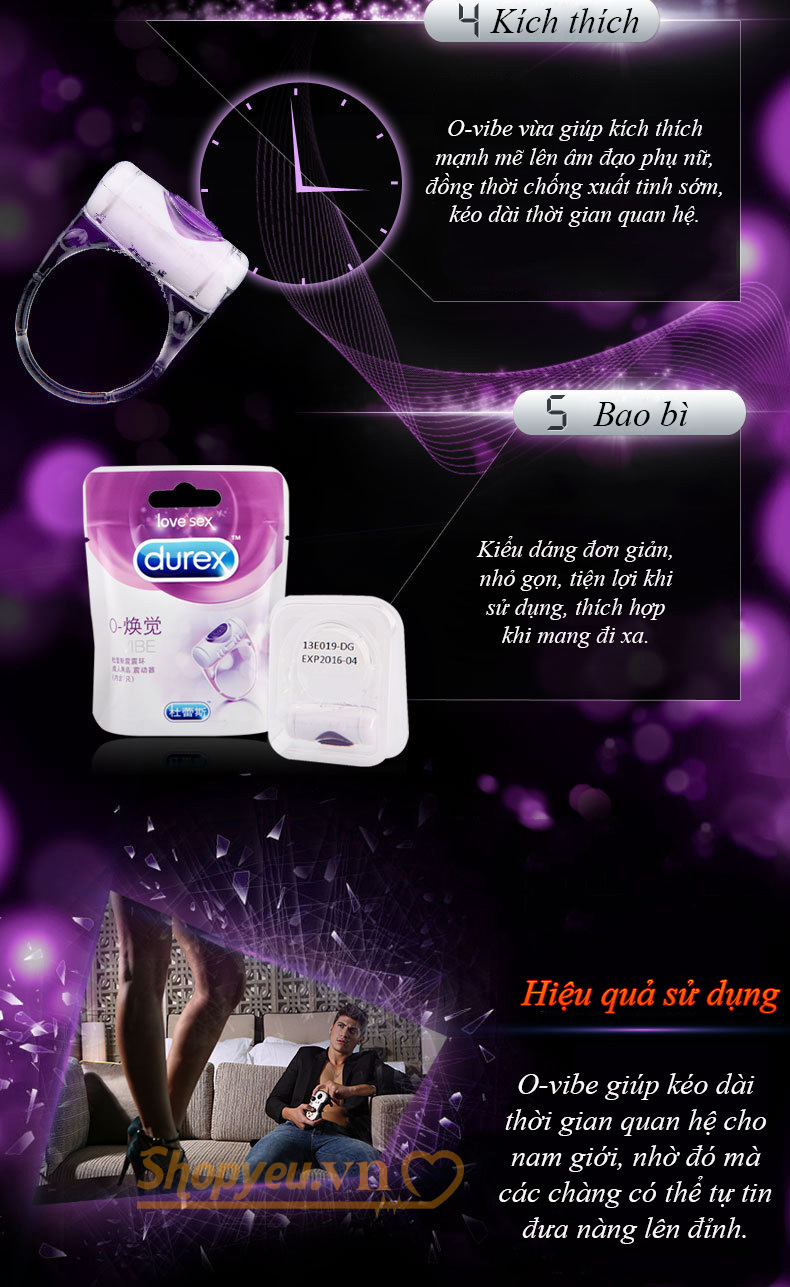 Như cho niềm vui kích thích là quan trọng đối với nhiều người đàn ông, vòng rung Durex này có thể giúp đạt được cực khoái lớn hơn từ lúc nhìn bắt đầu quan hệ với cô ấy, như vậy sản phẩm sẽ hỗ trợ chàng sẽ kích thích lến 20 phút với cục rung mạnh mẽ, khiến âm vật được kích thích nhiều hơn.