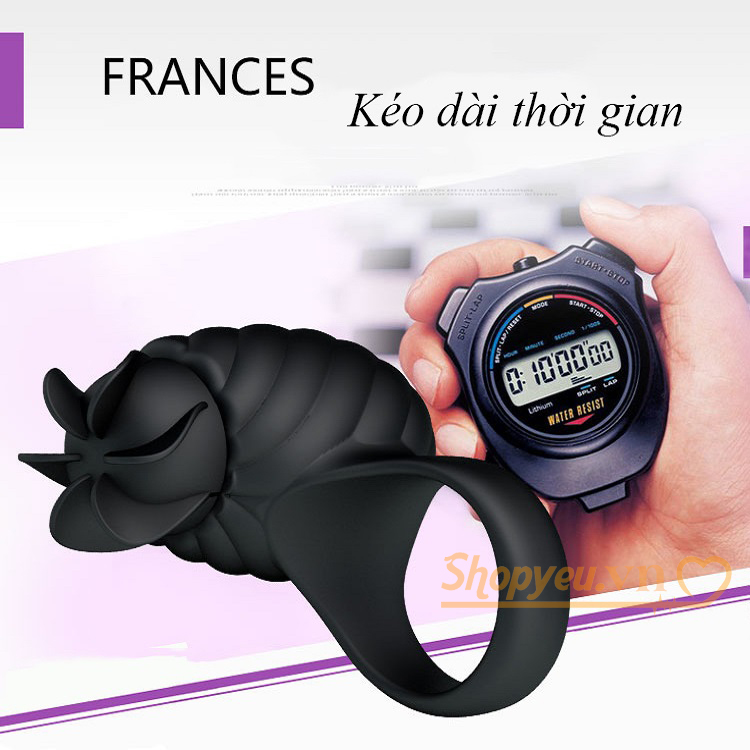 Vòng rung tình yêu Frances có thiết kế đặc biệt ngoài phần vòng rung được dùng để kìm hãm sự xuất tinh sớm ở nam giới ra, sản phẩm còn có thêm 6 cánh quạt xoay có tác dụng như chiếc lưỡi bú liếm và kích thích lên âm vật phụ nữ tạo những khoái cảm mạnh mẽ.